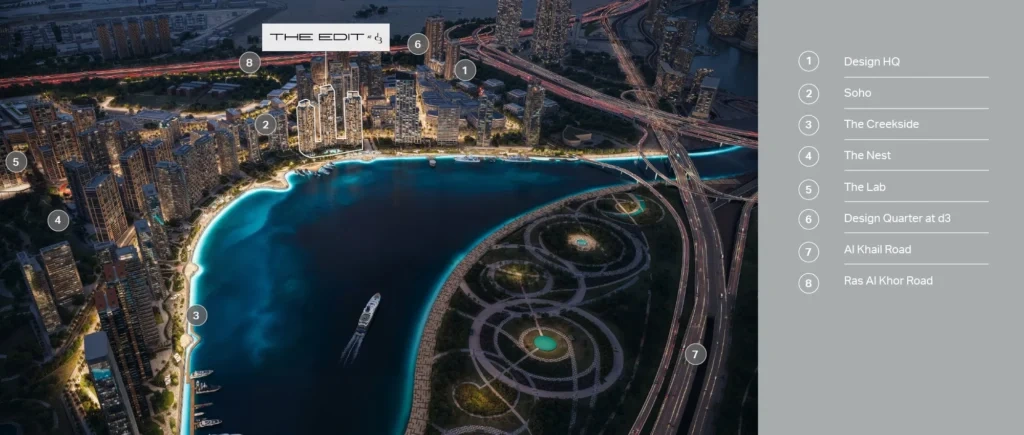 يتميز مشروع The Edit at d3 بموقع مركزي يسهل الوصول منه إلى أهم مناطق دبي. يمكن الوصول بسهولة إلى: • وسط مدينة دبي • Business Bay • مركز دبي المالي العالمي DIFC • مطار دبي الدولي • الطرق الرئيسية في المدينة هذا الموقع يجعل المشروع مناسبًا للمهنيين الذين يعملون في المناطق التجارية القريبة.